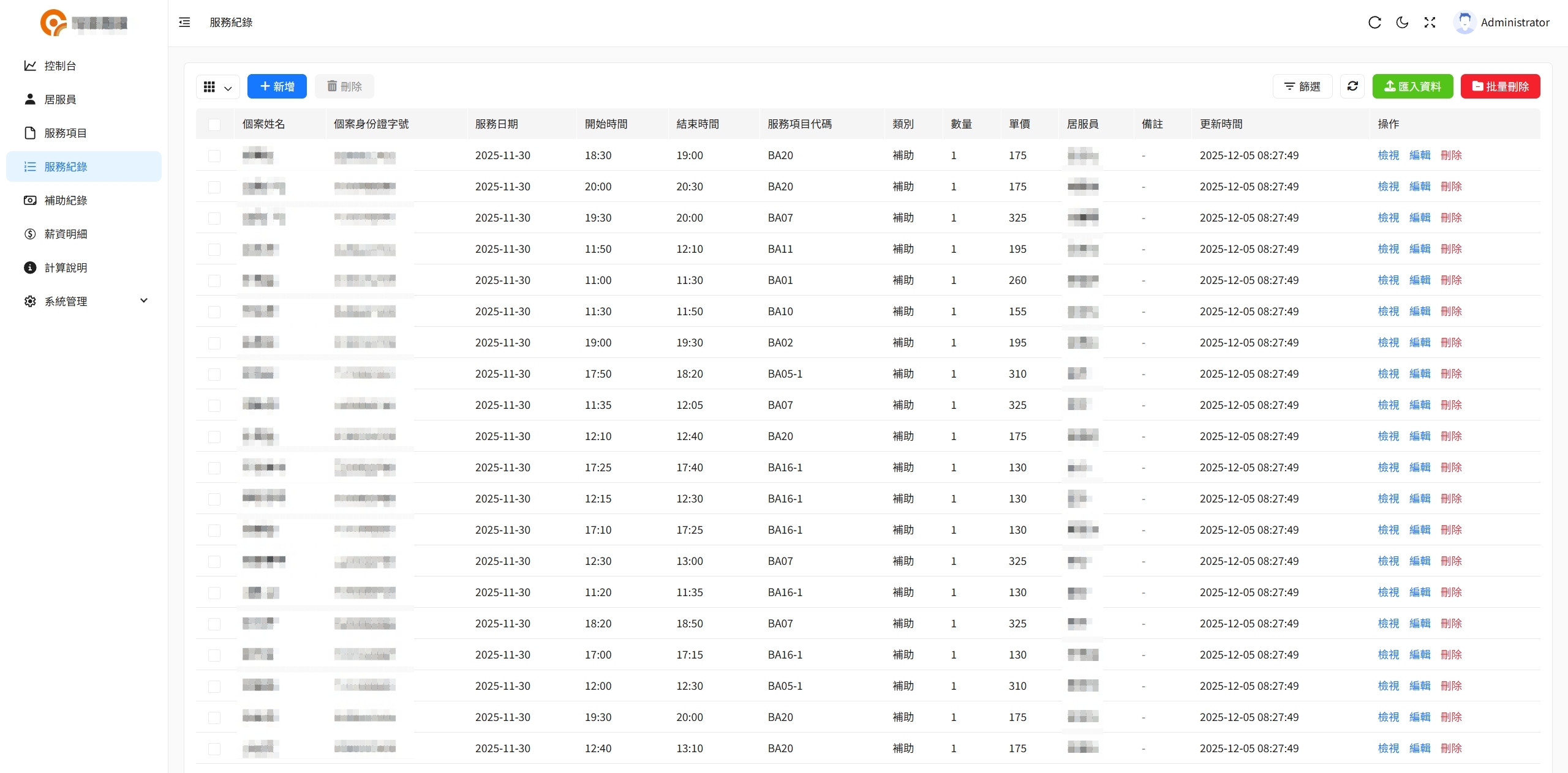 本系統為居家服務機構打造的內部薪資計算與資料整合平台。透過匯入外部 Excel(包含其他業務/排班/服務系統與政府補助資料),集中管理服務紀錄、補助紀錄、服務項目代碼,並依照機構自訂規則自動計算居服員薪資,產出薪資明細、總額彙總與對應依據,支援多角色權限控管與拆帳比例設定,提升行政效率並降低人為錯誤。